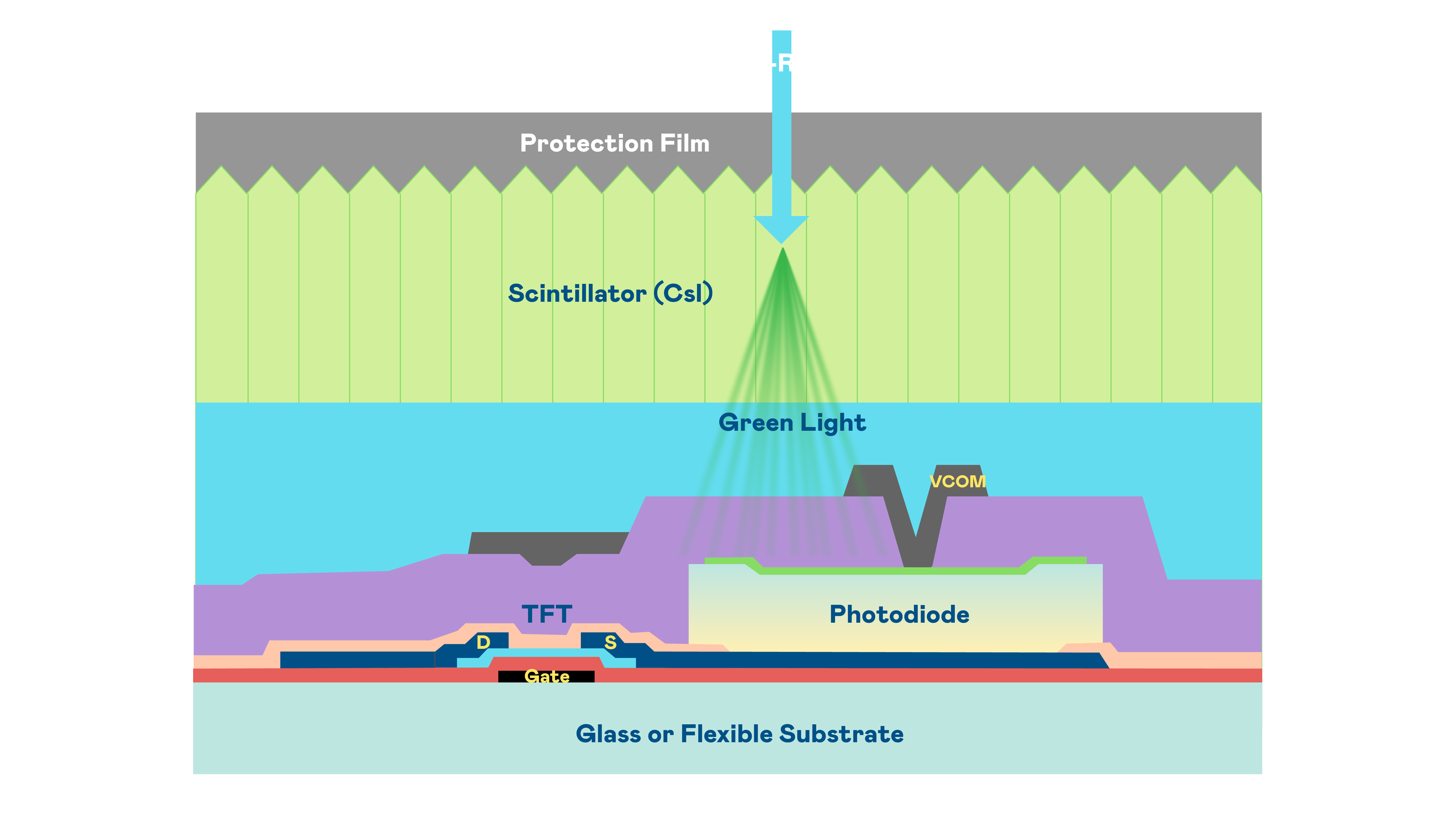 pg官网入口的X光影像感测阵列使用薄膜电晶体 (TFT) 作为每个像素的读取开关,搭配光电二极体(Photodiode)的光电转换元件,用以感测X光影像讯号。